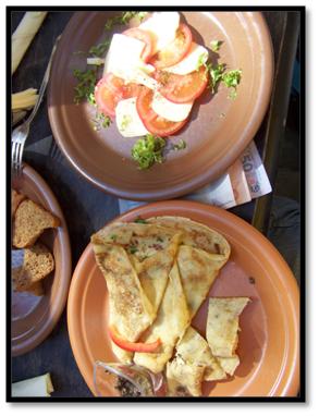 case in L’viv. Gothic styles with renaissance, baroque and neo classical buildings are evident as we walked along the city streets and hiked up the hillside to the ruins of the high castle that overlooks the magnificent city. Panoramic views of the old city gave an ideal insight into how large this city truly is; to be able to see the steeples and select areas that we had already wandered through at an aerial view was sincerely a picturesque experience. As we made our way down the highest point in the city; we just let our intuition and the visual appeal to guide our journey through the streets of L’viv. Market places, cafés, art galleries and museums at every turn. We ate at a café that seemed to be a popular local dining place and ate a variety of cheese from platters, tomato salad, salmon crepes and Turkish coffee. Delicious!!!