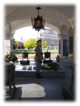 I then continued to walk and eventually approached a beautiful park that had a large fountain with many statues of Greek gods. In front of the entrance way stood the tomb of an unknown soldier with two guards watching over his resting place. A remarkable formation of flowers with various colors decorated the area around the tomb and many flower bouquets lay about in various assortments.