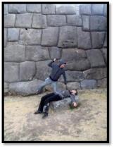 k in the rays of the sun. Deep colors penetrate the horizon with rolling hills and mountains become shadows against the sky. We play among the Inca ruins as Darren imitates sacrificial rituals of giving Carmen to the gods, a maze of walkways through stones so grand in stature that it makes you wonder how they were placed so perfectly together, two Chilean boys ask to pose with me for a picture as an elder man explains an abstract carving of a serpent in the stone wall.