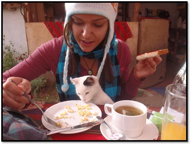 White with bright blue eyes; an adolescent feline scours for fragments of food left on table tops where back-packers once devoured their morning delights. At times he sat patiently next to those who continued to eat hoping to sneak in and swipe a few bites. He then crawled in Chala’s lap and continued to beg for a small ration of food and she was more than generous.