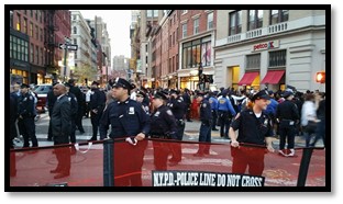 As we approach Union Square we are abruptly stopped as police barricade the street in front of us; in hopes of stopping protesters from advancing through the streets. They line-up, side-by-side, police are everywhere as the higher ranks bark orders. Chanting, flags, banners and signs raised high in the air. They divert from the street as they cut through an area of the side walk, police attempting to stop people from blocking traffic and taking over the streets. They walk with a peaceful intent, chanting back and forth: