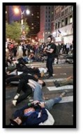 As we approached an intersection the leaders told everyone to form a circle and lay in the middle of the intersection as a tribute to the murdered Michael Brown who laid in the street for 4 hours and 32 minutes. They too lay there in the street for four minutes and thirty-two seconds to represent the hours and minutes that Brow